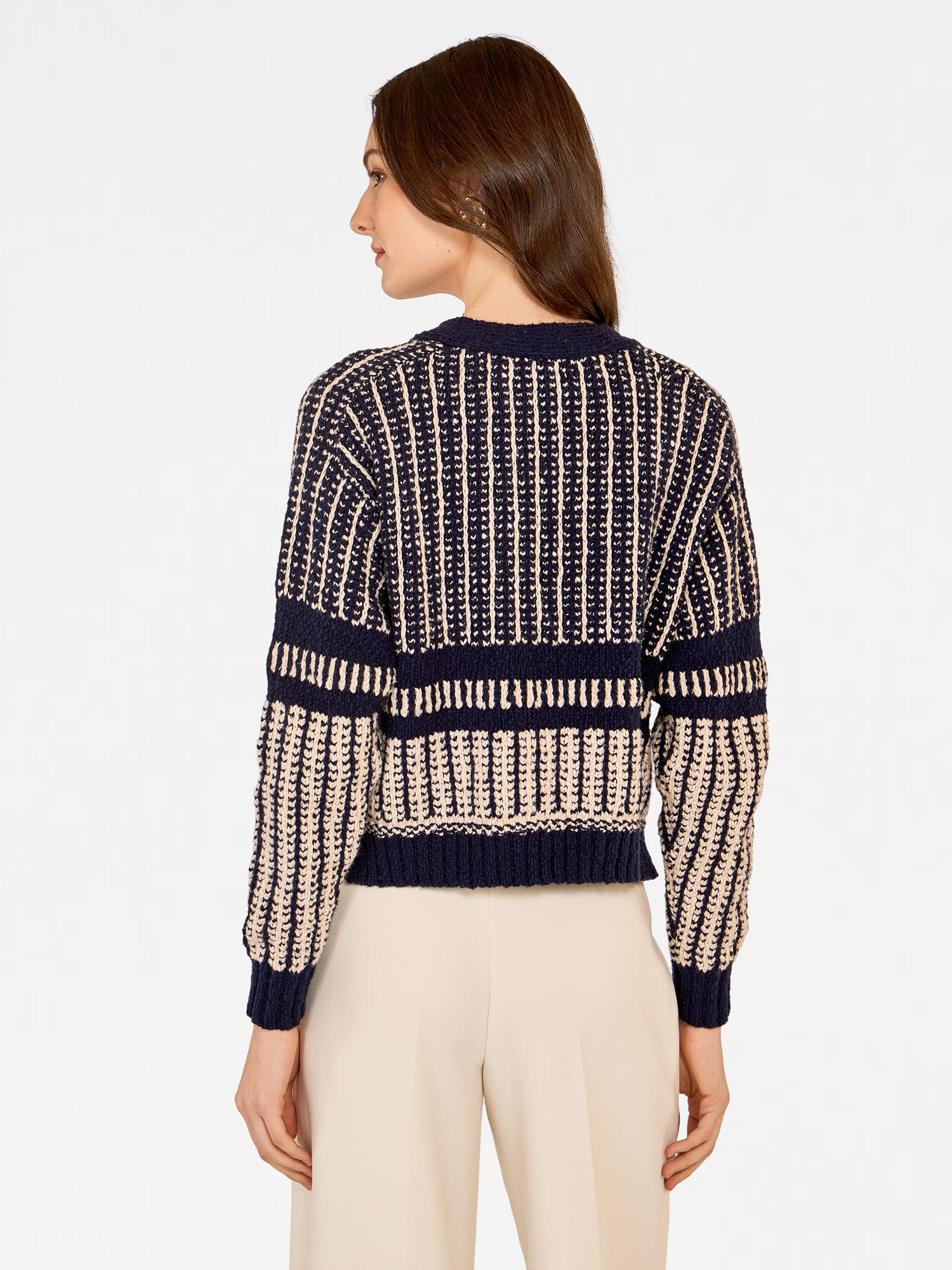 2-Tone Jacquard Cropped V-Neck Cardigan in Navy/Sand