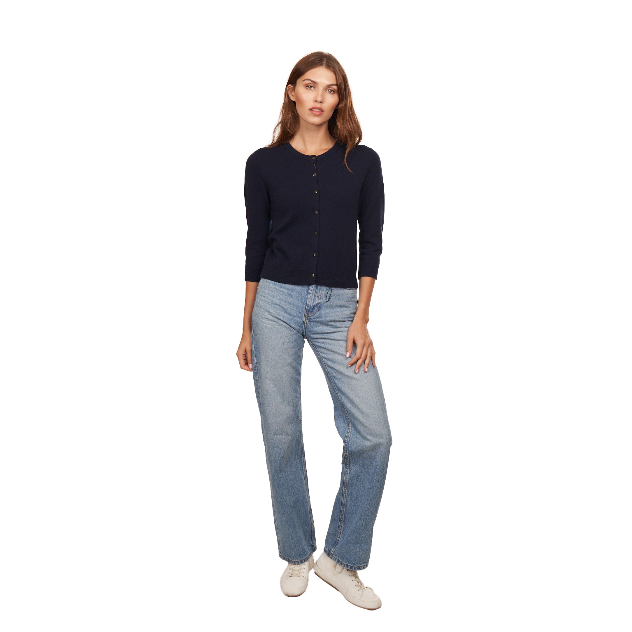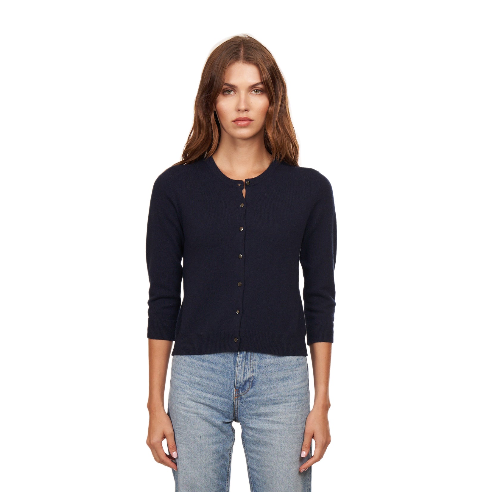 A true timeless classic, our Baby Cardigan is a closet staple. Crafted out of 100% cashmere, this cardigan features a button front enclosure, crew neckline, and quarter-length sleeves.