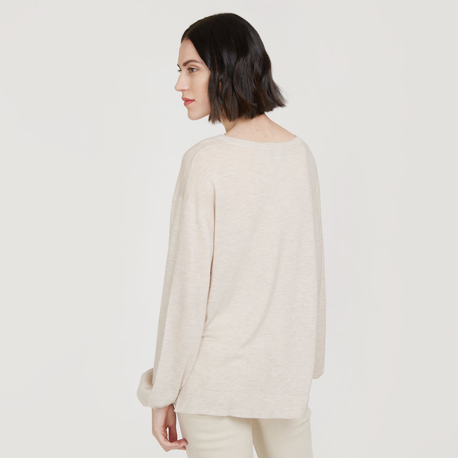 Made with the finest cashmere, this lightweight tunic is ideal when you want to achieve that casual effortless look. The split side seams and balloon sleeves adds just enough detail for the style you are trying to achieve. Pair with flowy linen pants or denim shorts.