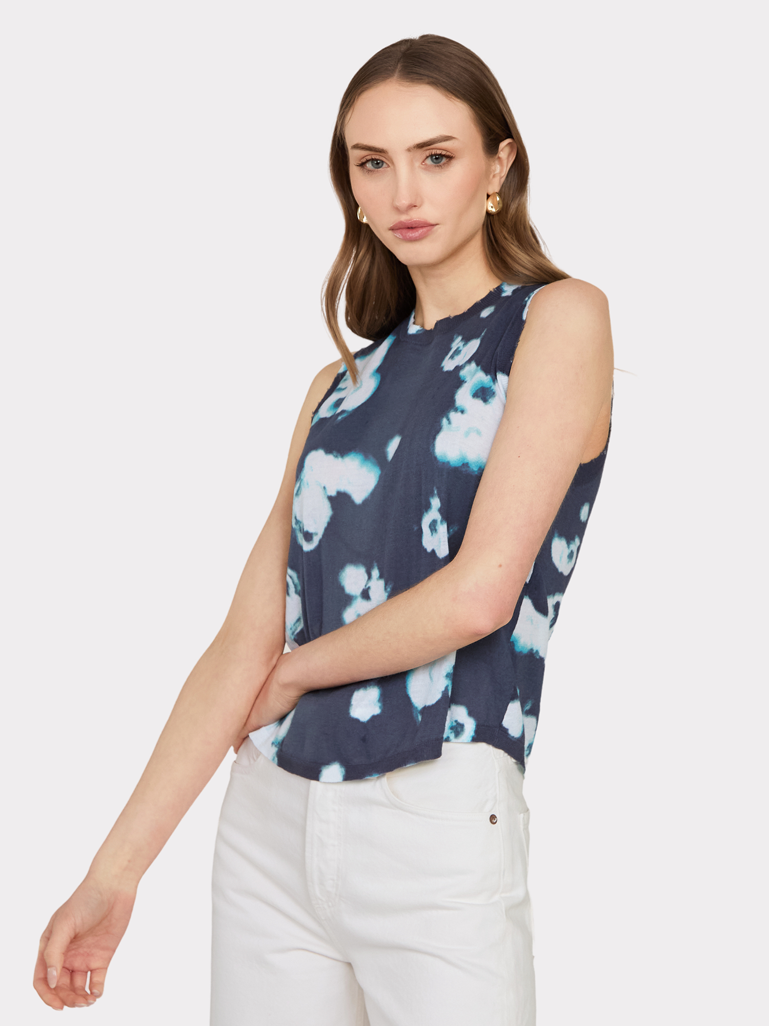 Our tank features a blotch print with distressed edges on neckline and armhole. Made of 100% Italian cotton.