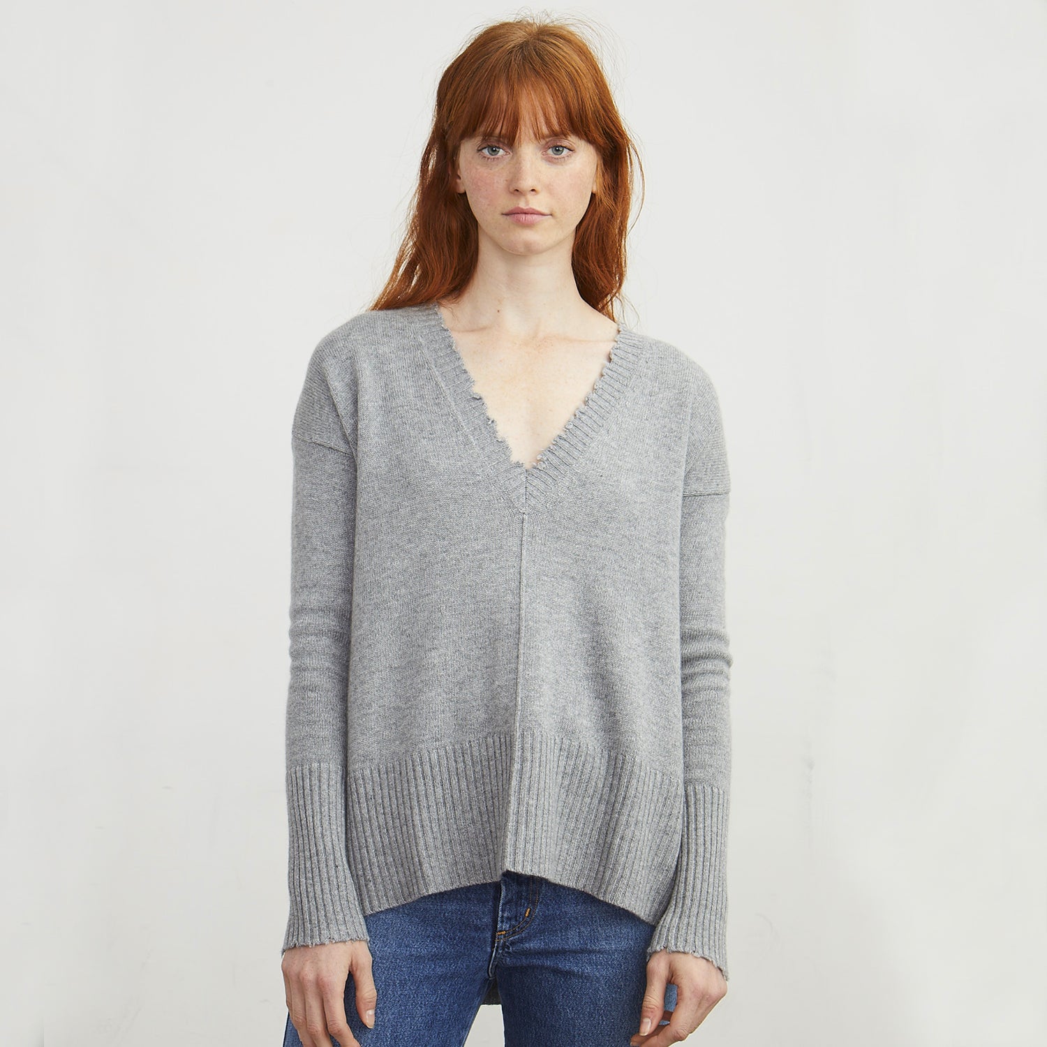 Distressed Edge V-Neck Pullover in Nickel
