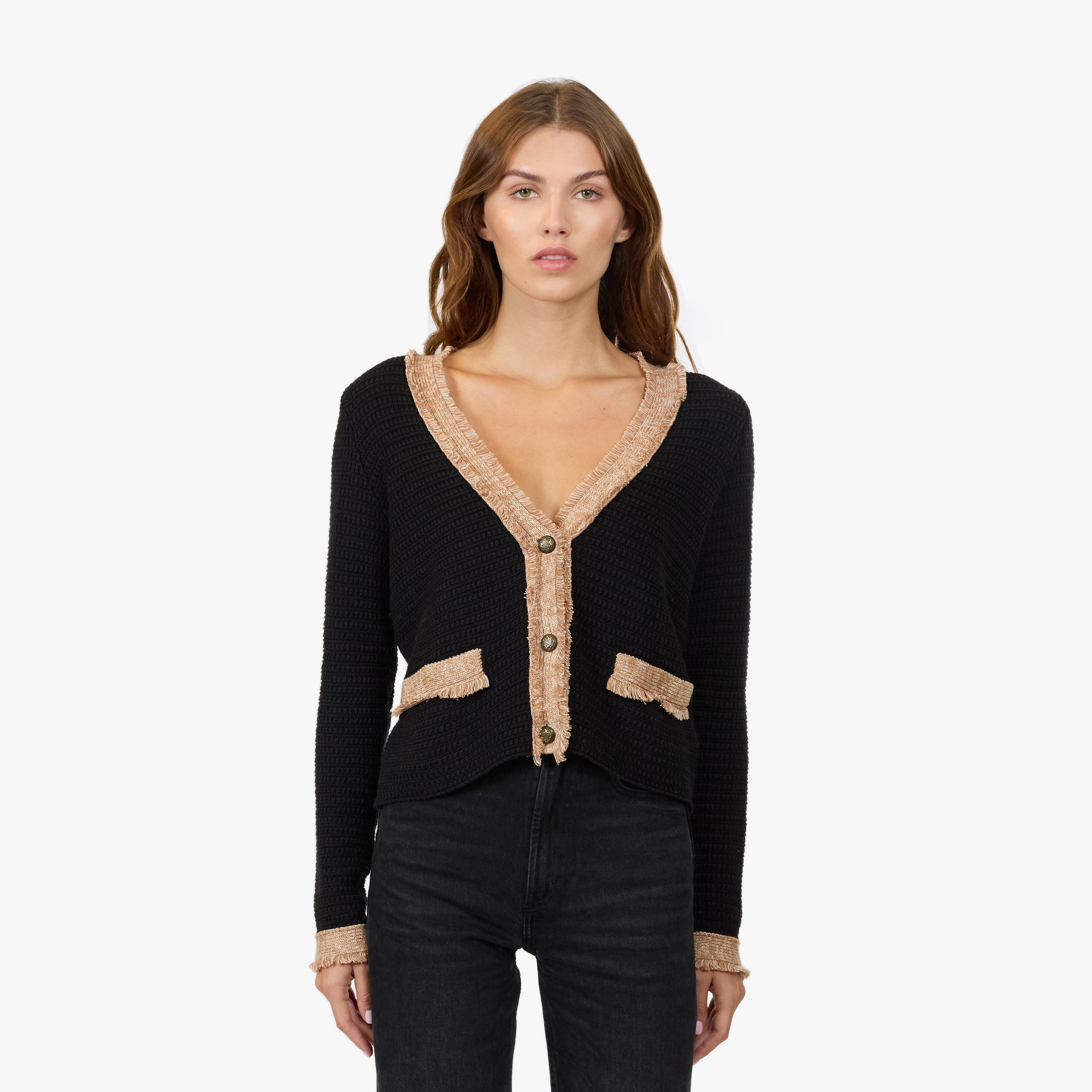 Fringed Trimmed V-Neck Jacket in Black Combo