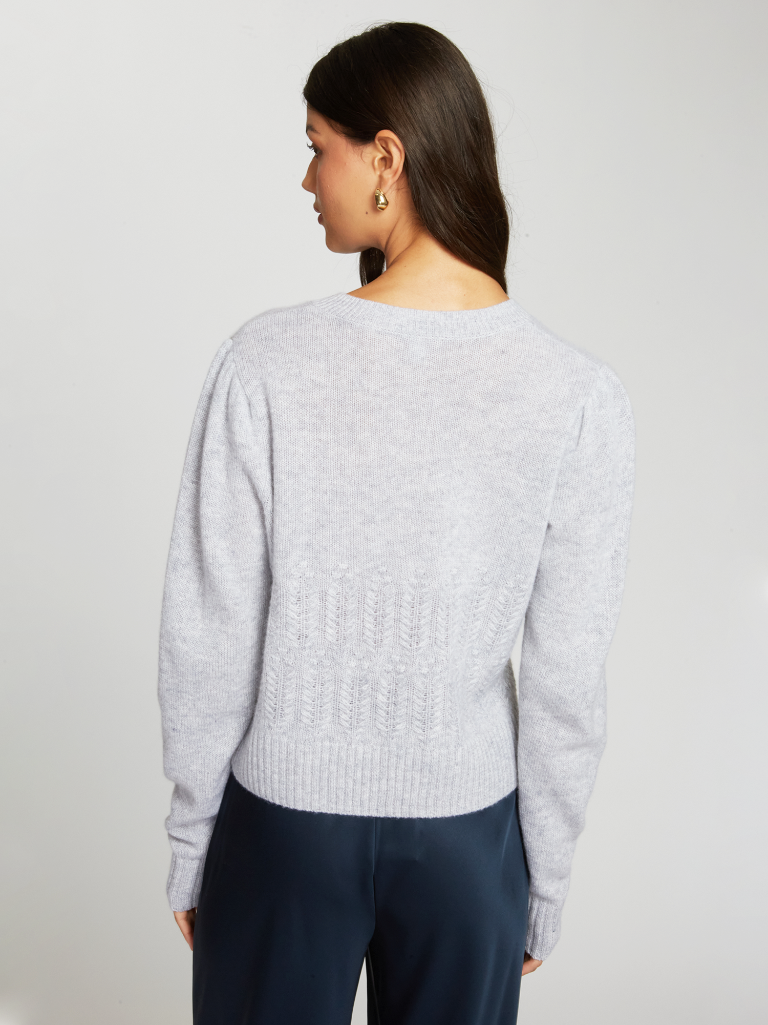 Our cardigan is made from pure cashmere and has a popcorn stitch knit. Ribbed trims trace the collar, cuffs, and hem, while a singular crystal button is placed on the crew.