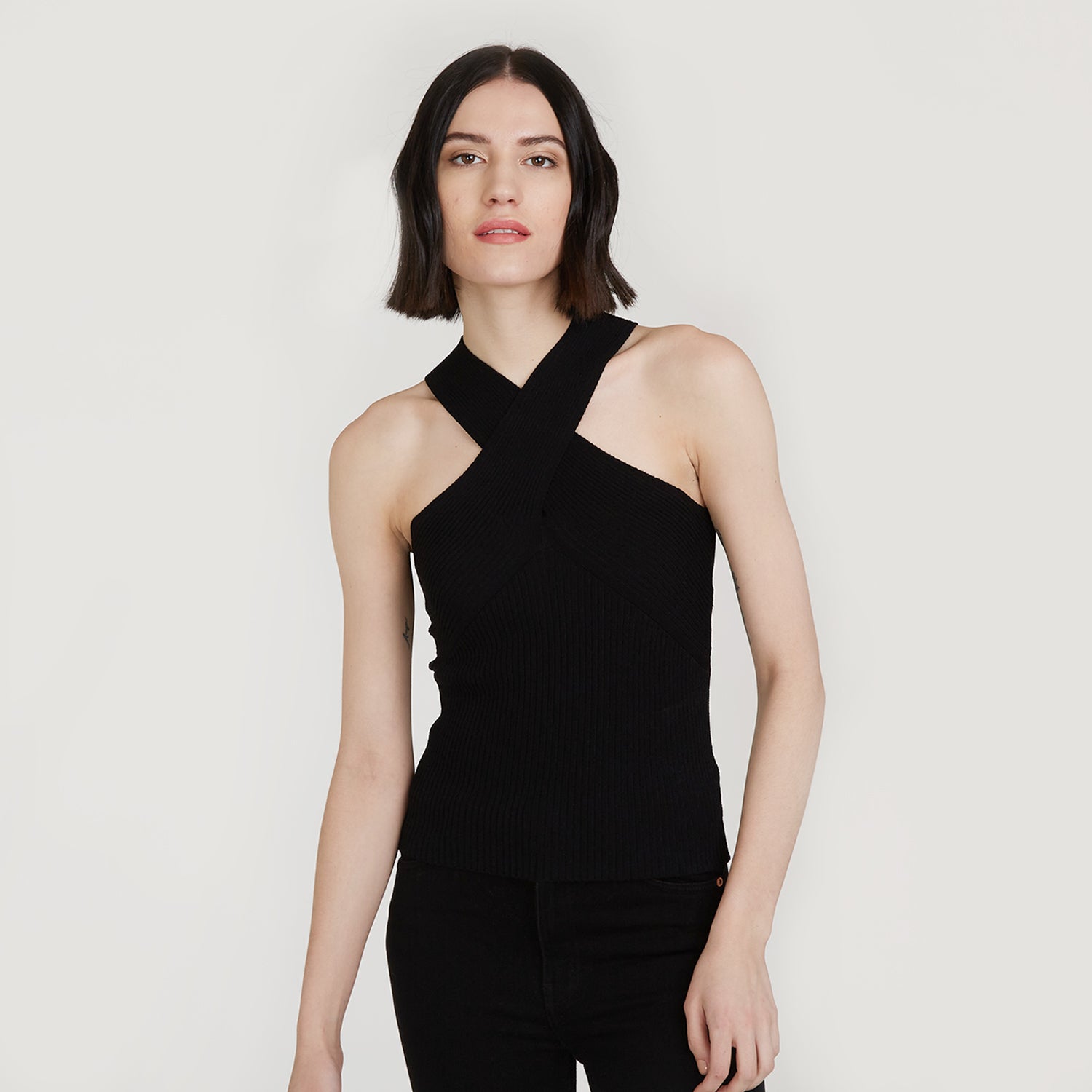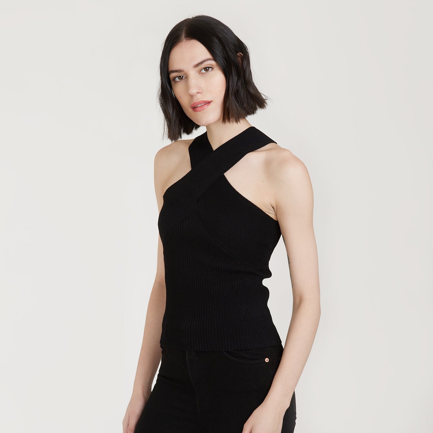 Rib Crisscross Halter in Black by Autumn Cashmere. Women's Black Top. Viscose Blend from Italy.