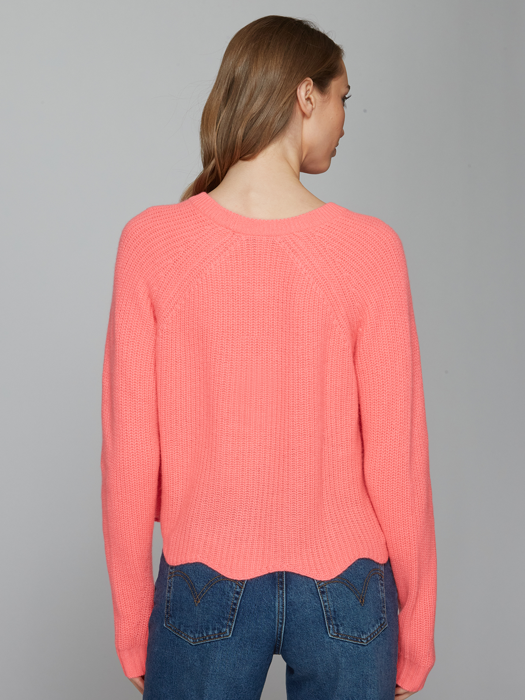 Our shaker is knitted from exceptionally soft cashmere; it’s designed for a slightly relaxed fit and defined by ribbed details and scallop hem.